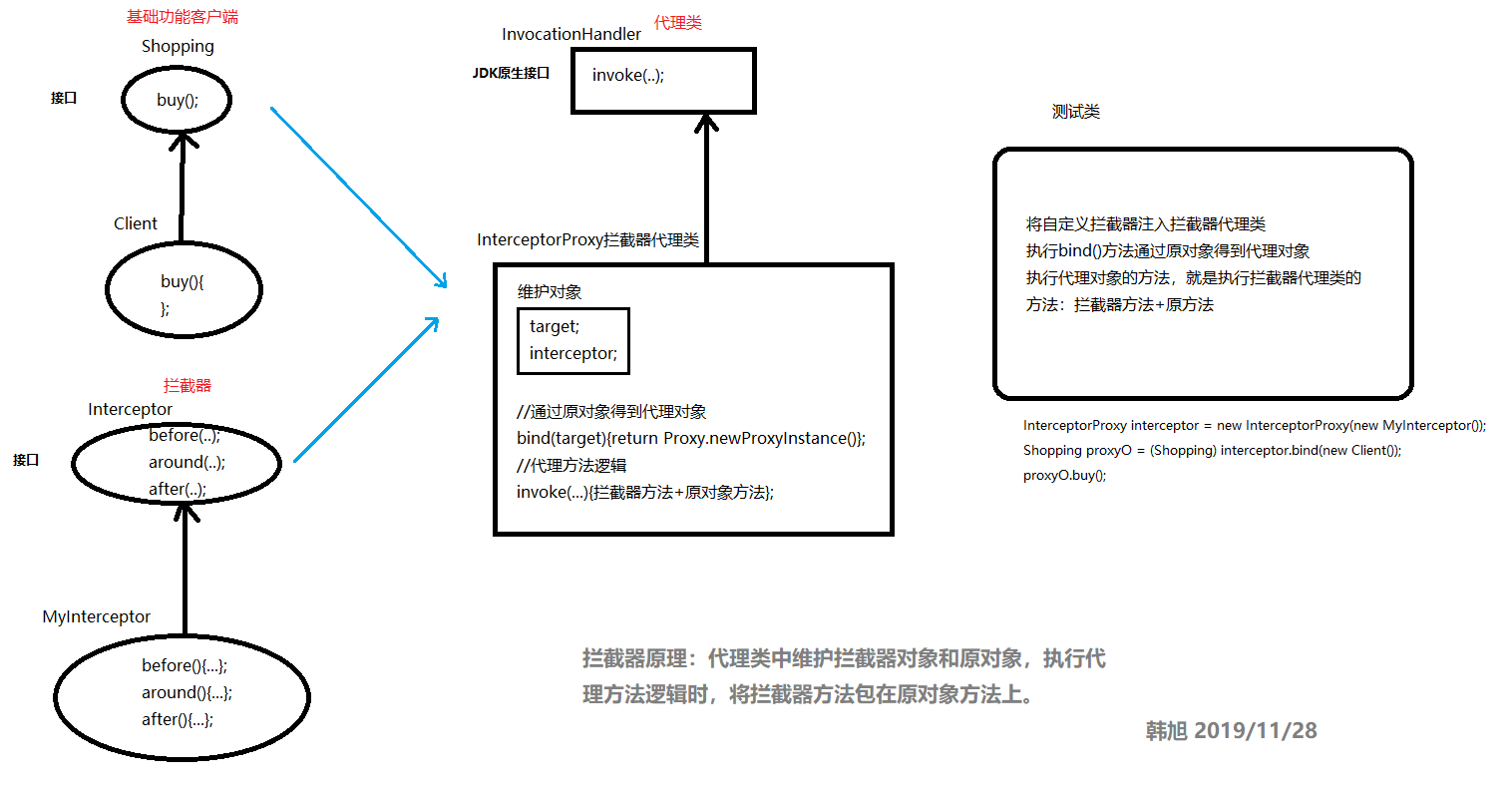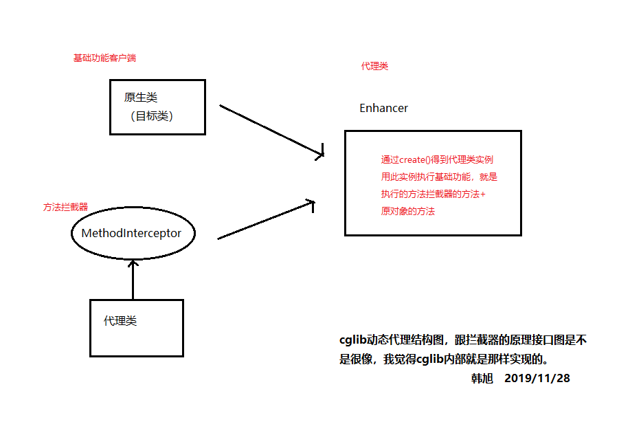 JAVA中的代理 2020-03-14 16:16 # 代理 > 代理模式是一种经典的设计模式,其意义在于生成代理对象,在服务提供方和使用方之间充当一个媒介,控制真实对象的访问。 拦截器在 Spring AOP 与 Spring MVC 中都有应用。在 Spring AOP 中, - 针对接口做代理默认使用的是 JDK 自带的 Proxy+InvocationHandler - 针对类做代理使用的是 Cglib 代理的作用:**不修改目标代码的情况下,控制对目标的访问**。可以在其前后加上自己的业务处理代码,甚至阻止对目标方法的访问,有点类似于过滤器和拦截器。 -  - 外部调用目标fun()方法时,使用代理类的方法,而不是原始的B类去操作对象,这样如果要对原始的fun()类添加权限控制,业务校验等,可以直接在代理类中添加业务代码,而不需要改变原有B类的核心功能代码。 Java中的代理分为**静态代理**和**动态代理**。静态代理比较简单,不够灵活,适用面比较窄,实际的应用中使用的基本都是动态代理。Java中的动态代理实现包括**JDK原生的动态代理**和**CGLIB动态代理**。JDK动态代理必须要有接口,而CGLIB可以不要接口。 ## 静态代理 > 静态代理的代码实现跟上面的图一摸一样 ### 代码 `IUserDao` **A** ```java package ProxyUtil.hx.insist; public interface IUserDao { int addUser(String name); void delUser(int id); int updateUser(String name); } ``` `UserDao` **B** ```java package ProxyUtil.hx.insist; public class UserDao implements IUserDao { @Override public int addUser(String name) { System.out.println("USER ADD..."); return 1; } @Override public void delUser(int id) { System.out.println("USER DEL..."); } @Override public int updateUser(String name) { System.out.println("USER UPDATE"); return 0; } } ``` `UserDaoStaticProxy` **代理类** ```java package ProxyUtil.hx.insist; /** * 静态代理 类 */ public class UserDaoStaticProxy implements IUserDao { private IUserDao userDao; public UserDaoStaticProxy(IUserDao userDao) { this.userDao = userDao; } //用户直接使用代理类,后续需要在基础功能上添加业务代码时,就可以在代理对象里面扩展功能,不用修改基础功能, @Override public int addUser(String name) { checkSecurity(); int i = userDao.addUser(name); if(i!=1) System.out.println("本次操作失败..."); return i; } @Override public void delUser(int id) { checkSecurity(); userDao.delUser(id); } @Override public int updateUser(String name) { checkSecurity(); int i = userDao.updateUser(name); if(i!=1) System.out.println("本次操作失败..."); return i; } //统一的安全检查 private void checkSecurity(){ System.out.println("Security check..."); } } ``` `Client` 客户端 ```java package ProxyUtil.hx.insist; /** * 静态代理 测试 */ public class Client { public static void main(String[] args) { UserDaoProxy userDaoProxy = new UserDaoProxy(new UserDao()); userDaoProxy.addUser("111"); userDaoProxy.delUser(1); userDaoProxy.updateUser("222"); } } //输出 /* Security check... USER ADD... Security check... USER DEL... Security check... USER UPDATE 本次操作失败... */ ``` ### 总结 静态代理简单易理解,但灵活性非常受限,**要代理哪个类**,**必须手动写一个目标接口的实现类**,**要代理多少个目标接口**,**就得写多少个代理类**。且静态代理中对于原生类(目标类)中的每个方法都要设置一种处理方案,原生类中有100个方法,代理类如果对这100个方法做的处理是一样的(例如在进入方法前校验参数),那么就要写100个代理方法,非常繁琐。动态代理比较灵活,只需要写一个代理类即可。 ## 动态代理 ### 代码 `IUserDao`和`UserDao`仍然使用之前的。 `UserDaoDynamicProxy` 代理类 ```java package ProxyUtil.hx.insist; import java.lang.reflect.InvocationHandler; import java.lang.reflect.Method; import java.lang.reflect.Proxy; /** * 动态代理 类 */ public class UserDaoDynamicProxy implements InvocationHandler { private Object target; //得到代理对象 public Object get(Object target){ this.target = target; //生成代理对象 Object o = Proxy.newProxyInstance(target.getClass().getClassLoader(), target.getClass().getInterfaces(), this); return o; } /** * 动态代理,调用代理对象的方法时,其实都是调用的target目标对象的对应方法,所有额外的业务处理都在invoke()里面写,所以只能做统一的处理,不能对每个方法分别处理 * @param proxy * @param method * @param args * @return * @throws Throwable */ @Override public Object invoke(Object proxy, Method method, Object[] args) throws Throwable { checkSecurity(); Object invoke = method.invoke(target, args); return invoke; }//invoke()反射技术 //统一处理 private void checkSecurity(){ System.out.println("Security check..."); } } ``` `Client2` 客户端 ```java package ProxyUtil.hx.insist; /** * 动态代理测试 */ public class Client2 { public static void main(String[] args) { UserDaoDynamicProxy userDaoDynamicProxy = new UserDaoDynamicProxy(); //得到代理对象 IUserDao userDao = (IUserDao) userDaoDynamicProxy.get(new UserDao()); //使用代理对象进行操作 userDao.addUser("111"); userDao.delUser(1); userDao.updateUser("222"); } } /* Security check... USER ADD... Security check... USER DEL... Security check... USER UPDATE */ ``` **我们也可以新增一个基础功能类** `ICropDao` **A** ```java package ProxyUtil.hx.insist; public interface ICropDao { void sow(); void harvest(); } ``` `CropDao` **B** ```java package ProxyUtil.hx.insist; public class CropDao implements ICropDao { @Override public void sow() { System.out.println("Crop sow..."); } @Override public void harvest() { System.out.println("Crop harvest..."); } } ``` 动态代理类不变,客户端测试: `Client2` ```java package ProxyUtil.hx.insist; /** * 动态代理测试 */ public class Client2 { public static void main(String[] args) { UserDaoDynamicProxy userDaoDynam