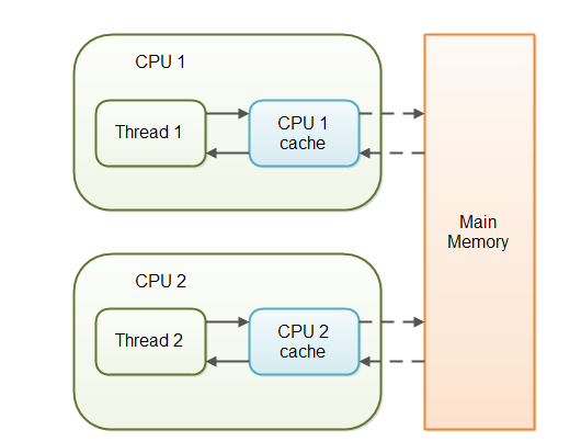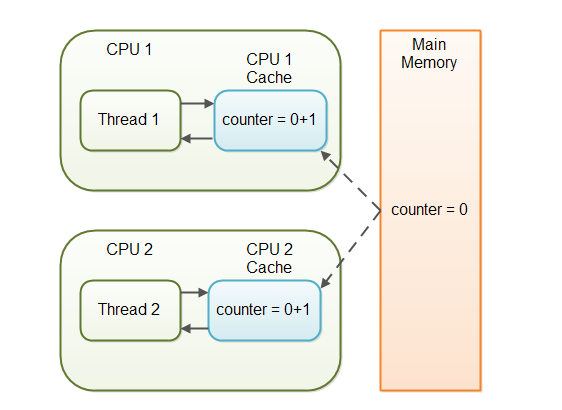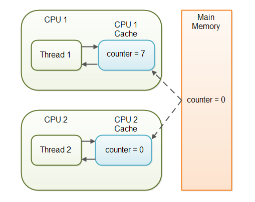 volatile关键字 2020-03-14 16:17 > 注意:本文引用的内容已经发现某些地方有错误,还未删改。请勿阅读。正确的内容请见:http://riun.xyz/work/183 *参考链接: [http://ifeve.com/java-volatile%e5%85%b3%e9%94%ae%e5%ad%97/](http://ifeve.com/java-volatile关键字/)* > volatile不能完整的保证变量的可见性,volatile修饰一个变量表示的是这样: 每次读取volatile变量,都应该从主存读取,而不是从CPU缓存读取。每次写入一个volatile变量,应该写到主存中,而不是仅仅写到CPU缓存。 > > 所以只适应于部分情况。一个线程修改了变量,另一个线程读取变量,那么将变量声明为volatile,就能保证写入变量后,对另一个现成的读取是可见的。 > > 但如果多个线程都修改了变量的值,主存中也能存储正确的值,但这有一个前提:变量新值的写入不能依赖旧值。如果依赖旧值,那么多个线程对变量的修改就可以覆盖,导致最终得不到正确结果。 ### 总述 在 **JDK1.2** 之前,Java 的内存模型实现总是**从主存**(即共享内存)**读取变量**,是不需要进行特别的注意的。而在**当前**的 Java 内存模型下,线程可以把变量保存本地内存(比如机器的**寄存器**)中,而不是直接在主存中进行读写。**这就可能造成一个线程在主存中修改了一个变量的值,而另外一个线程还继续使用它在寄存器中的变量值的拷贝**,造成数据的不一致。 Java的volatile关键字用于标记一个变量“应当存储在主存”。更确切地说,每次读取volatile变量,都应该从主存读取,而不是从CPU缓存读取。每次写入一个volatile变量,应该写到主存中,而不是仅仅写到CPU缓存。 从JDK1.5开始, volatile关键字除了保证volatile变量从主存读写外,还提供了更多的保障。 比如①提供了**完整的volatile可见性**保证: - 如果线程A写入一个volatile变量,线程B随后读取了同样的volatile变量,则线程A在写入volatile变量之前的所有可见的变量值,在线程B读取volatile变量后也同样是可见的。 - 如果线程A读取一个volatile变量,那么线程A中所有可见的变量也会同样从主存重新读取。 即:若在修改volatile变量之前修改了其他变量,那么当对volatile变量修改时,会将其他非volatile变量一起更新至主存;当读取volatile变量时,会一起读取其他非volatile变量。因此可以使用volatile变量来保证程序中其他变量的可见性:**在读取一系列变量值时先读取volatile变量,在写入一系列变量值时最后写入volatile变量。** 例如: ```java public class MyClass { private int years; private int months private volatile int days; public int totalDays() { int total = this.days;//读取volatile变量,同时从主存中读取其他所有变量的值 total += months * 30; total += years * 365; return total; } public void update(int years, int months, int days){ this.years = years; this.months = months; this.days = days;//写入volatile变量,同时强制将其他所有变量的值写入主存 } } ``` ②提供**happens-before原则**为volatile关键字的可见性提供强制保证,避免了指令重排可能带来的隐患: - 如果有读写操作发生在写入volatile变量之前,读写其他变量的指令不能重排到写入volatile变量之后。 - 如果有读写操作发生在读取volatile变量之后,读写其他变量的指令不能重排到读取volatile变量之前。 即在未重排时能够受到volatile变量带来的“有益”影响的变量不能失去这份影响。而在未重排时没有得到volatile变量带来的“有益”影响的变量可以通过重排得到这份影响。 ### 变量可见性问题 Java的volatile关键字能保证变量修改后,对其他线程是可见的。而普通变量(非volatile变量)通常是不可见的。 在一个多线程的应用中,线程在操作普通变量时,出于性能考虑,每个线程可能会将变量从主存拷贝到CPU缓存中(**可以理解为寄存器**)。如果你的计算机有多个CPU,每个线程可能会在不同的CPU中运行。这意味着,每个线程都有可能会把变量拷贝到各自CPU的缓存中。  如果有两个以上的线程访问一个共享对象,这个共享对象包含一个counter变量 ```java public class SharedObject { public int counter = 0; } ``` 如果只有线程1修改了(自增)counter变量( counter的值不保证会从CPU缓存写回到主存中 ),而线程1和线程2两个线程都会在某些时刻读取counter变量。 此时, CPU缓存和主存中的counter变量值并不一致 。  这就是“可见性”问题,线程看不到变量最新的值,因为其他线程还没有将变量值从CPU缓存写回到主存。一个线程中的修改对另外的线程是不可见的。 ### volatile可见性保证 > volatile的可见性保证存在限制:多个线程同时写入volatile变量的值时,变量新值的写入不能依赖变量的旧值 Java的volatile关键字就是设计用来解决变量可见性问题。 将counter变量声明为volatile,则在写入counter变量时,也会同时将变量值写入到主存中。同样在读取counter变量值时,也会直接从主存中读取。 ```java public class SharedObject { public volatile int counter = 0; } ``` 将一个变量声明为volatile,可以保证变量写入时对其他线程的可见。 在上面的场景中,一个线程(T1)修改了counter,另一个线程(T2)读取了counter(但没有修改它),将counter变量声明为volatile,就能保证写入counter变量后,对T2是可见的。 然而,如果T1和T2都修改了counter的值,只是将counter声明为volatile还远远不够。 ### volatile的缺陷 volatile能保证所有读取都是从主存中读取,所有写入都是直接写入到主存。但是此情况下还是不能适用于所有多线程并发情况。像前面说的: **volatile的可见性保证存在限制: