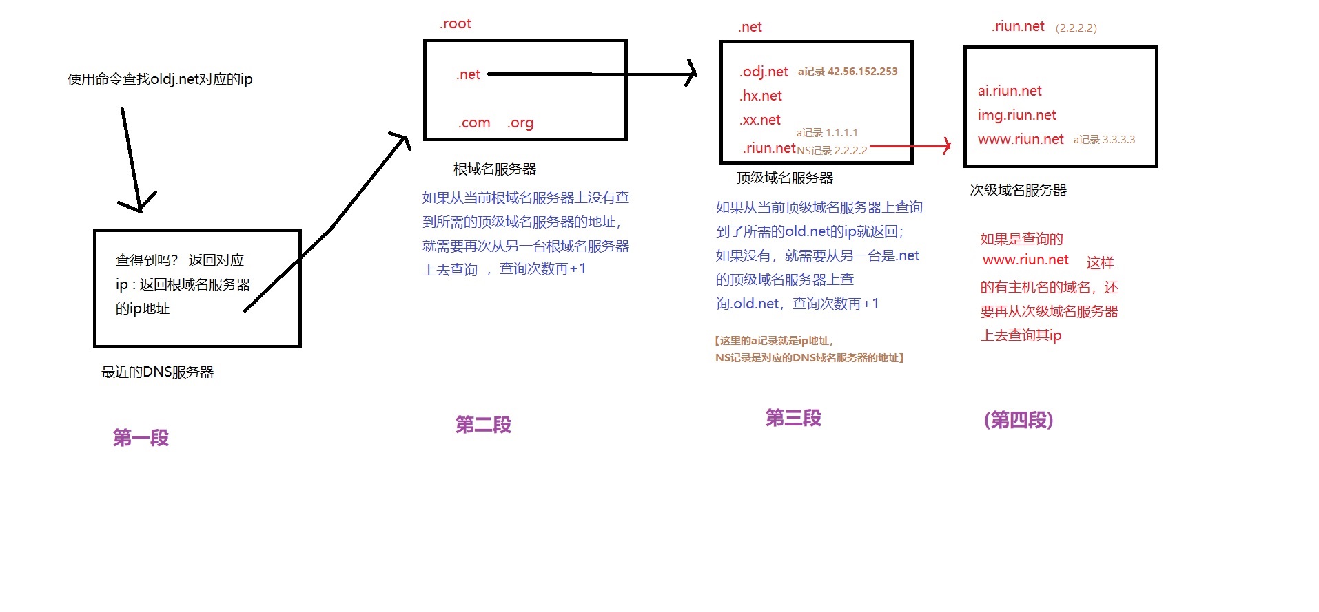 话说DNS及域名&ip 2020-03-16 22:03 本篇主要解决两个问题: 1、DNS究竟是什么? 2、查询一个域名的ip会经过几次DNS服务器? > 阅读本篇的前置知识是大致知道访问一个url会先去DNS服务器根据域名解析出ip地址,然后才能正确的访问到对应的服务器。 ### DNS究竟是什么? DNS (Domain Name System 的缩写)域名系统服务。 他们是一台台**服务器**(你可以将其想成电脑),作用是根据域名查询出ip地址(这个过程我们叫做DNS解析),以及控制因特网的电子邮件的发送。**我们就称之为DNS服务器**。你可以将其想象做一个电话本。 用专业的话说,DNS是一种分布式网络目录服务。 ### 查询一个域名的ip会经过几次DNS服务器? #### 1、首先,我们要明确什么是域名。 www.baidu.com , oldj.net , riun.xyz , 这样的叫做域名。 **域名是有层级的**,所有域名的尾部,都有一个根域名.root。因为所有域名都有,所以平时就将其省略了。 比如:www.baidu.com 其实是 www.baidu.com.root oldj.net 其实是 oldj.net.root。平时用的只是简写(不过你如果输入 www.baidu.com.root 是无法访问的,因为会在其尾部默认加上一个.root,那么就变成了 www.baidu.com.root.root) 而域名的层级,是从后往前的。即位置靠“后面的”属于“上层”。 域名的层级为:主机名.次级域名.顶级域名.根域名。 比如:www.baidu.com 根域名为.root ,顶级域名为.com ,次级域名为.baidu ,主机名为www(又称三级域名) #### 2、其次,我们要做出一个假设 【查询一个域名的ip会经过几次DNS服务器?】这个问题并不等同于【在浏览器输入域名后敲回车经过了几次DNS服务器才找到对应ip】 由于我并不知道查一个域名的ip是否需要先去所谓的提供“根据域名查询ip”服务的网络应用,如果是,就要多加一次,因为去这个网络应用所在的服务器还需要一次DNS解析。 所以我现在假设不存在这个【网络应用】,而是直接通过命令(dig,nslookup等),查询一个域名对应的ip。 比如要查询oldj.net对应的ip。 查询域名对应的ip先从最近的DNS服务器去查找,如果找到就是1次;没有找到,就要从当前DNS服务器上找到内置的根域名服务器地址(第1次); 从根域名服务器上寻找顶级域名服务器(net)所在的DNS的ip地址(第2次),假设最好的情况下仅查询了一台根域名服务器就查询到了net这个顶级域名服务器对应的ip,那么就找到了net这个顶级域名存在的DNS服务器; 接着需要从net所在的这个DNS服务器上查找次级域名(oldj)的DNS服务器的ip(第3次),假设最好情况下当前顶级域名服务器(net)上就能够找到oldj对应的ip,就找到了。如果没有,就从其他DNS服务器上找(存有net这个顶级域名的DNS服务器有很多,在第一台上没有找到oldj对应的ip,就换下一台找) **所以我的答案是:≥1 次。** 不仅跟域名有关(oldj.net这样没有主机的域名天然比 www.baidu.com 这样有主机的域名要查询DNS的次数少),也跟所查询的DNS服务器有关(当前服务器上是否有所需的ip或者NS信息,如果没有就要接着下一台DNS服务器查询),还与最近的DNS服务器上是否存在当前域名的ip有关。 下图手画,可以配合文字观看(右键在新标签页打开查看大图)。  --- 本期参考资料: - 阮一峰,DNS原理入门:https://www.ruanyifeng.com/blog/2016/06/dns.html - 户根勤《网络是怎样连接的》【微信读书可阅】 - [百度百科-DNS](https://baike.baidu.com/item/%E5%9F%9F%E5%90%8D%E7%B3%BB%E7%BB%9F%EF%BC%88%E6%9C%8D%E5%8A%A1%EF%BC%89%E5%8D%8F%E8%AE%AE/15134609?fromtitle=DNS&fromid=427444&fr=aladdin) --END--